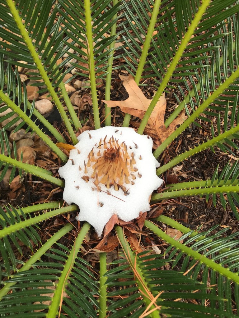 Normally, when it snows in South Central Texas it looks like this little bitty pile on our Sego Palm. I took this photo, as a joke, to document our first snow day as a married couple. Little did I know that this was the first of many snow days to come.