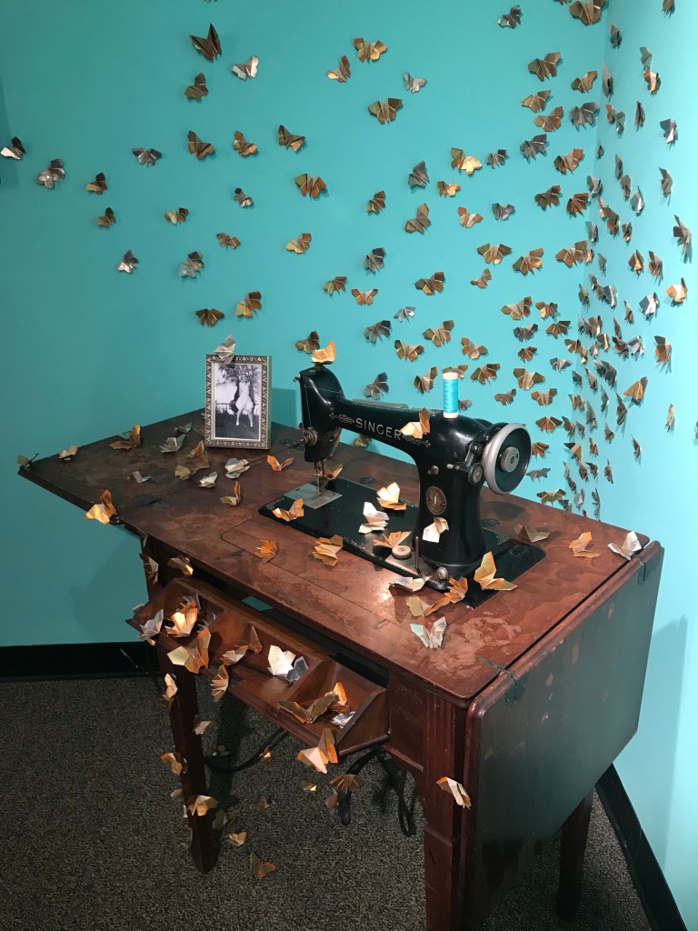 Towards the end of the exhibit, we found this 1930’s sewing machine that belonged to the artist’s mother, along with more origami butteries!