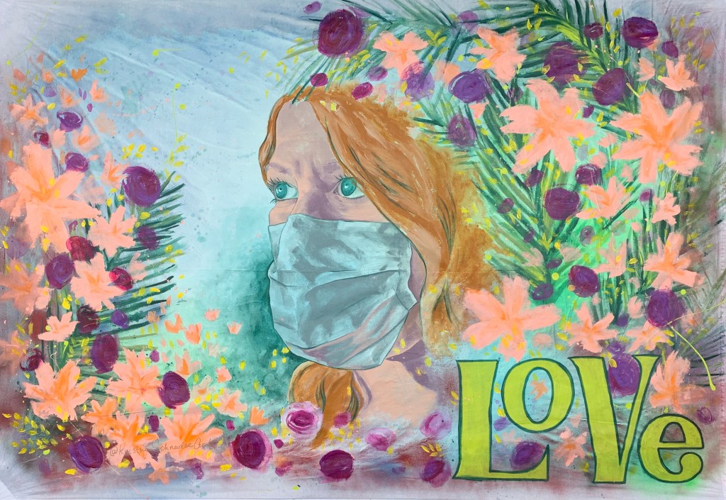 Someone in the neighborhood was making something of their own – huge colorful banners for their yard: A strong blue eyed nurse presenting the word “Love” for World Health Day; the word “Victory” rising up out of darkness with the sun shining its rays onto a garden; a collage of happy images surrounding the words “Find Joy in the Little Things.”
