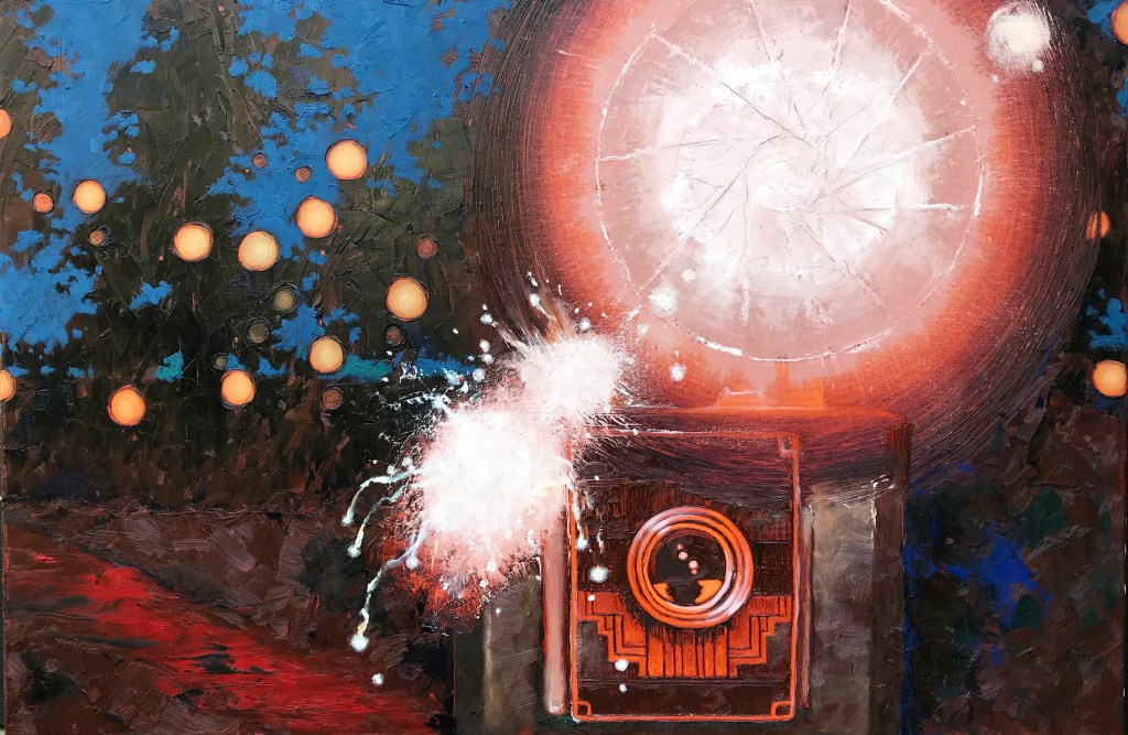 Smile, this blog is for you! For those of you missing graduation, prom, birthdays, weddings and other celebrations, this piece is for you. Artist Kristine Schneider occasionally preps her canvases in “Burnt Sienna” and works the color back out through her technique. One example of this is the oil on canvas art deco camera called “Lovely Tonight.” It reminds us that even though we are missing some of these events, we can still celebrate them.